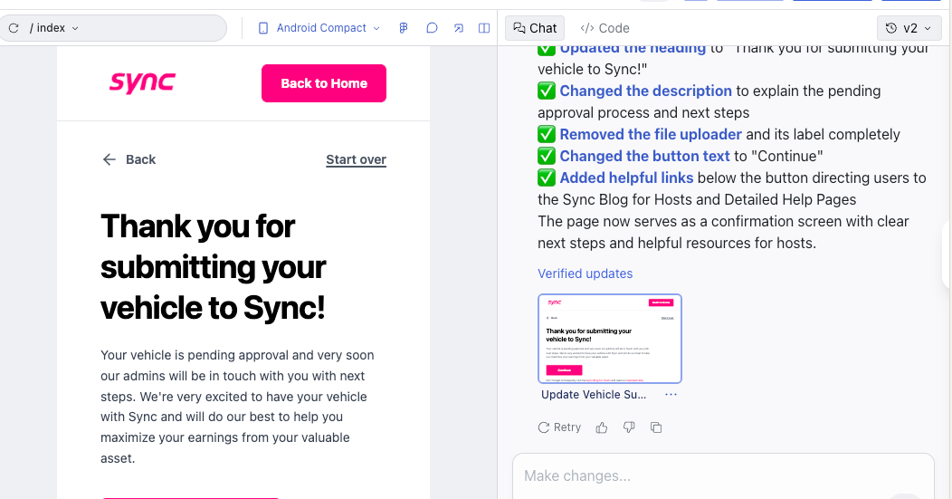 Το MagicPatterns είναι ένα από τα AI εργαλεία που υπάρχουν στην αγορά για να φτιάχνεις fully interactive prototypes με text prompts. Υπάρχουν πολλά άλλα (MagicPath, Lovable, v0, Bolt κ.ά.) αλλά εγώ βρίσκω το MagicPatterns το πιο ευέλικτο. Για κάθε μία από τις οθόνες που περιγράφει ο Claude, μου δίνει ξεχωριστό prompt το οποίο βάζω στο MagicPatterns και μετά από λίγα λεπτά έχω την πλήρη εμπειρία που θα έχει ο πελάτης όταν η οθόνη υλοποιηθεί. Σημαντική παράμετρος: έχω ήδη “ταΐσει” το MagicPatterns με το brand identity του Sync, οπότε οι οθόνες είναι fully branded.